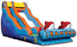 The Big Kahuna wet/Dry Slide is perfect for little beach combers and surfers at your festival or party. A great way to cool off, this exciting ride allows participants to climb 17 feet to a No-Jump Top, which forces riders to slide down correctly, keeping them secure. A midway hump will have riders saying "Cowabunga!" into the safety-ended pool at the bottom of this impressive wet/Dry Slide. A beachy, blue and orange ocean theme completes the Big Kahuna look, with a pair of orange fish waiting at the bottom of the slick and cool slide. This wet or Dry Slide is just one of the many amazing inflatable slides. The Big Kahuna dual wet/Dry Slide is a great way to promote enjoyable and healthy activity, and will add excitement and value to any indoor or outdoor event! With a variety of colors, shapes and themes, the slides offer kids of all ages endless amounts of aerobic activity. Our slides are made safe and secure with lite n strong, fire-resistant vinyl making it safer, portable and more durable.